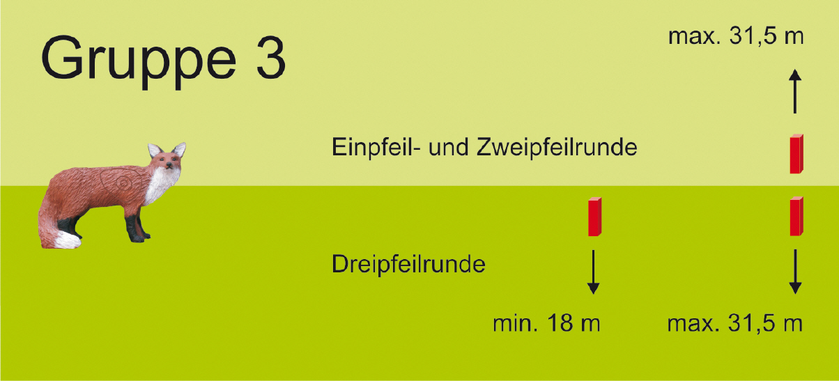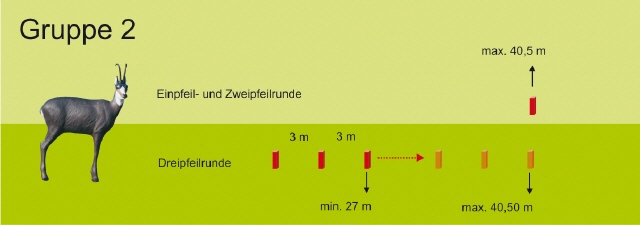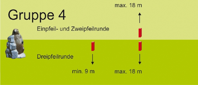 Zu kurze Entfernungen zeigen nicht das wahre Niveau der Schützen, extrem weite Schüsse sind für viele nur Glücksache. Daher empfiehlt es sich, die Entfernungen der IFAA zu verwenden. Hier ist es möglich, einen relativ einfachen, aber auch einen sehr schwierigen Kurs zu setzen. Das Wichtigste dabei ist, dass es eine Ausgewogenheit zwischen nahen und weiteren Schüssen gibt. Die IFAA unterteilt die Scheiben in vier Gruppen. Und jede Gruppe lässt bezüglich der Entfernung mehrere Möglichkeiten offen.