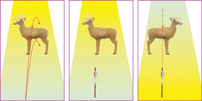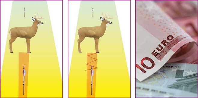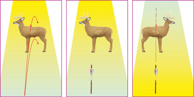 Der Pfeil geht drüber oder drunter. Man merkt sich, wo der Pfeil über oder unter die Scheibe geflogen ist. | Dann markiert man den Punkt, von dem man geschossen hat, mit einem Pfeil. | Nun geht man auf die andere Seite des Ziels und steckt in Verlängerung der Linie „Abschusspfeil zu x„ ebenfalls einen Pfeil in den Boden. |