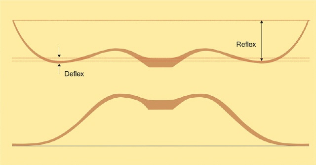 Man betrachtet den Bogen im abgespannten Zustand (Bild unten). Der Deflex wird durch den Abstand vom vorderen Ende des Griffs (A) bis zum tiefsten Punkt im Wurfarm (B) gemessen. Den Wert des Reflexes sieht man am Abstand vom tiefsten Punkt im Wurfarm (B) bis zur Sehnenkerbe (C).