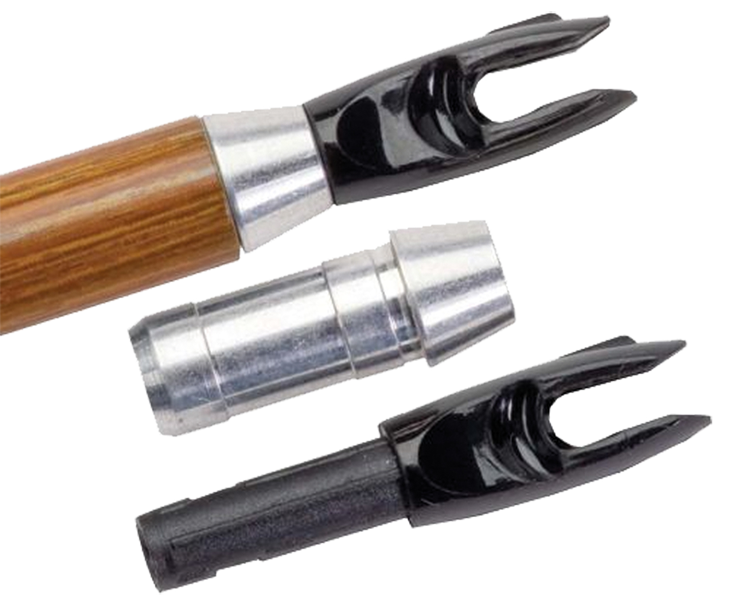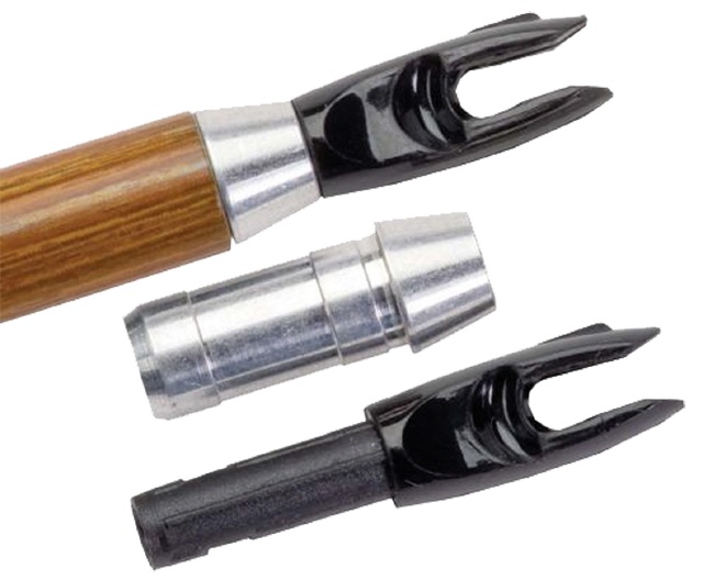 Auf einen angespitzten Konus wird eine Nocke geklebt. Ausgefallene Nocksysteme eignen sich nur bedingt für Holzpfeile.