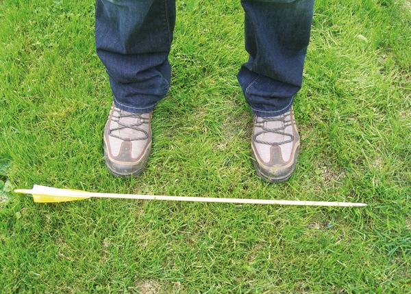 Man stellt sich zuerst parallel zum Ziel. Das kann man mit einem Pfeil, den man genau an die Fußspitzen anlegt, überprüfen.