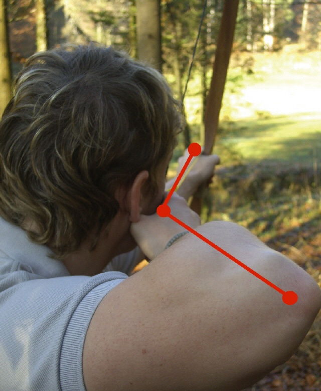 Hat man nun den Ankerpunkt erreicht, ist es wichtig, die Rückenspannung aufzubauen. Dabei werden vereinfacht ausgedrückt die drei Punkte, Bogenhand, Zughand und Ellbogen, in eine Linie gebracht. Man muss dabei also den Ellbogen nach hinten bewegen. Damit hält man die Sehne nicht nur, sondern man ist immer auf Zug.