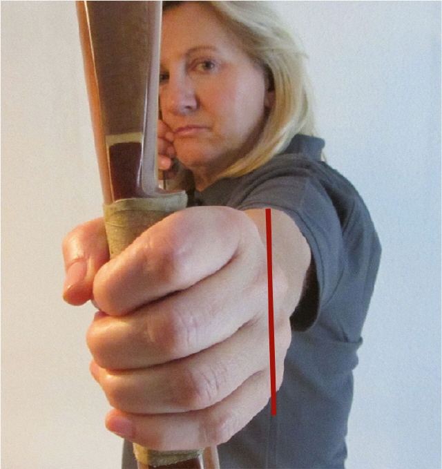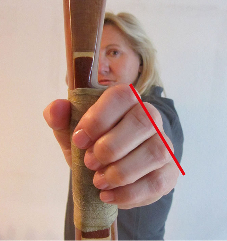 Man hält den Bogen locker. Durch diese Haltung stehen die Knöchel in einem Winkel von rund 45° schräg nach unten. Beim Ziehen des Bogens richtet er sich bei korrekter Haltung automatisch in Schussrichtung aus, sodass ein Verdrehen verhindert wird. Beim Abschuss schließt sich die Hand automatisch und verhindert, dass der Bogen aus der Hand rutscht.