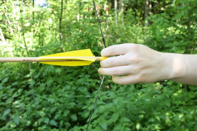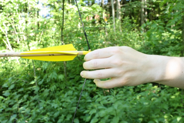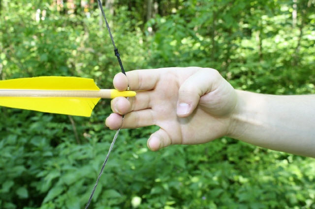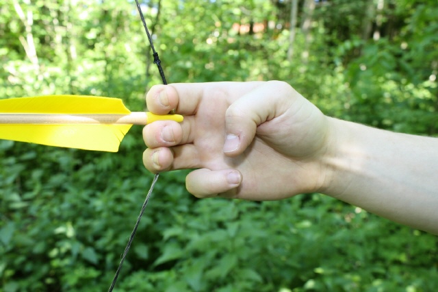 Untergriff: Alle Finger sind unter dem Pfeil, nur ein Finger berührt ihn.