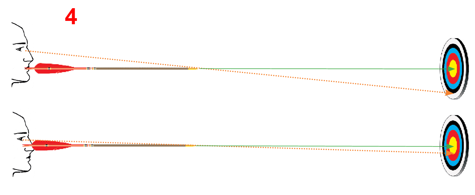 Für welche Zieltechnik bietet sich dieser Anker an? Ziele ich instinktiv, intuitiv oder bin ich Gap-Shooter, ist der Abstand zwischen Auge und Pfeil weniger wichtig (Bild 1 und 2). Da man ja hier mit dem Gefühl oder mit dem Unterbewusstsein den Abschusswinkel einstellt. Zielt man hingegen mit der Pfeilspitze – Point of Aim oder auch Systemschießen genannt – kann es durchaus Vorteile bringen. Damit wandert die Pfeilspitze näher an das Ziel, welches man treffen möchte. Der Abstand der Pfeilspitze zum eigentlichen Ziel ist relativ klein. Und je länger der Pfeil ist, desto weiter wandert die Pfeilspitze bei gleichem Abschusswinkel in Richtung des eigentlichen Ziels (Bild 4).