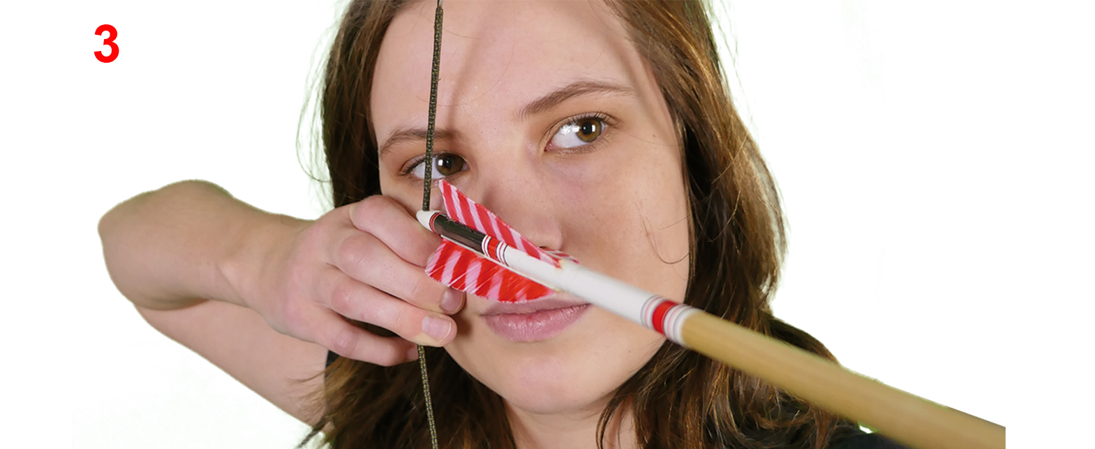 Will man mit dem Pfeil möglichst nahe an das Auge, funktioniert das eigentlich nur mit einem Untergriff (Bild 3). Und der ist bei Turnieren oft nur mit dem Recurve erlaubt. Damit ist der Winkel zwischen Sehlinie und Pfeil relativ klein. Dieser ist bei einem anderen Anker, beispielsweise mit dem Zeigefinger im Mundwinkel, wesentlich größer.