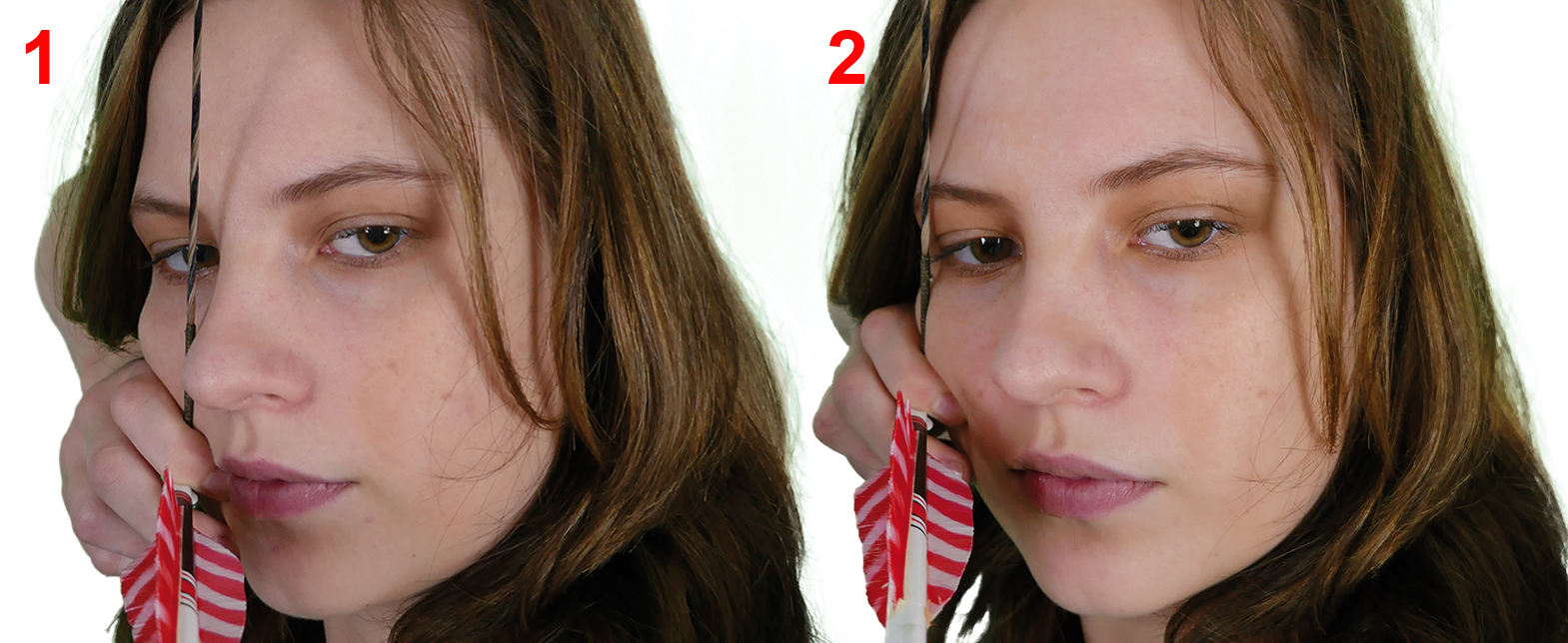 Die zweite Bedingung hat mit dem Zielen zu tun. Die Sehne sollte nämlich vor dem Auge sein. Damit ist der Pfeil genau darunter und zeigt beim Abschuss auf das Ziel. Steht die Sehne neben dem Auge, muss das irgendwie ausgeglichen werden (Bild 2). Das hängt auch mit der verwendeten Zieltechnik zusammen. Wer mit der Pfeilspitze zielt, wird so immer links vorbeischießen. Kommen wir nun zum eigentlichen Thema. Was bringt der Anker, bei dem der Pfeil knapp unter dem Auge liegt?