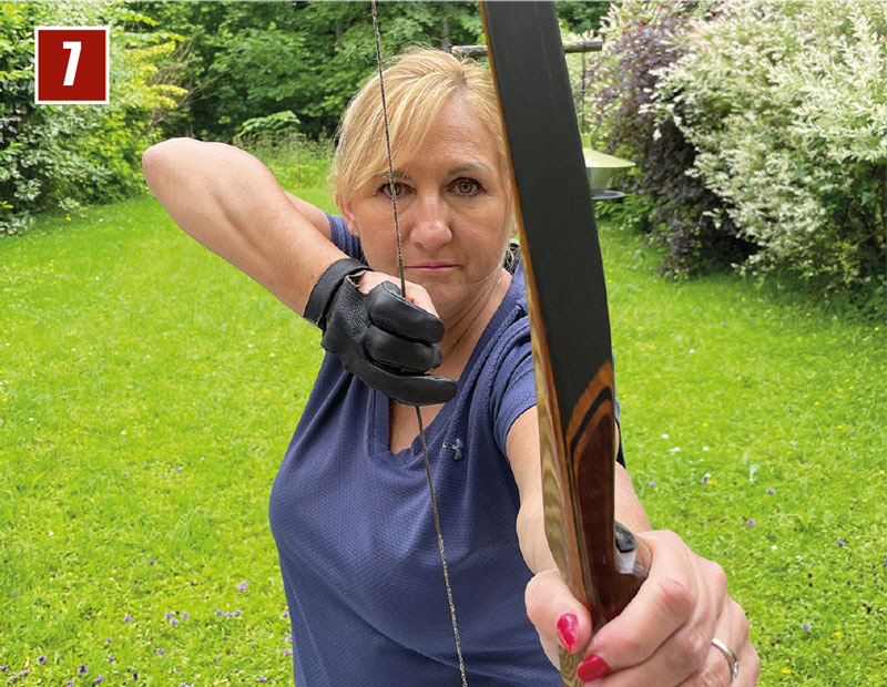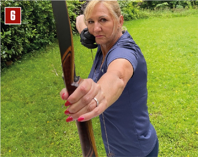 Hat man das einigermaßen im Griff, kann man es mit dem eigenen Bogen üben. Dabei ist wichtig, dass man auf Zug ist. Dazu geht man leicht in die Vorspannung und dreht den Ellbogen aus. Auch hier gilt das Gleiche: Ausdrehen und 20 Sekunden halten (Bild 6).