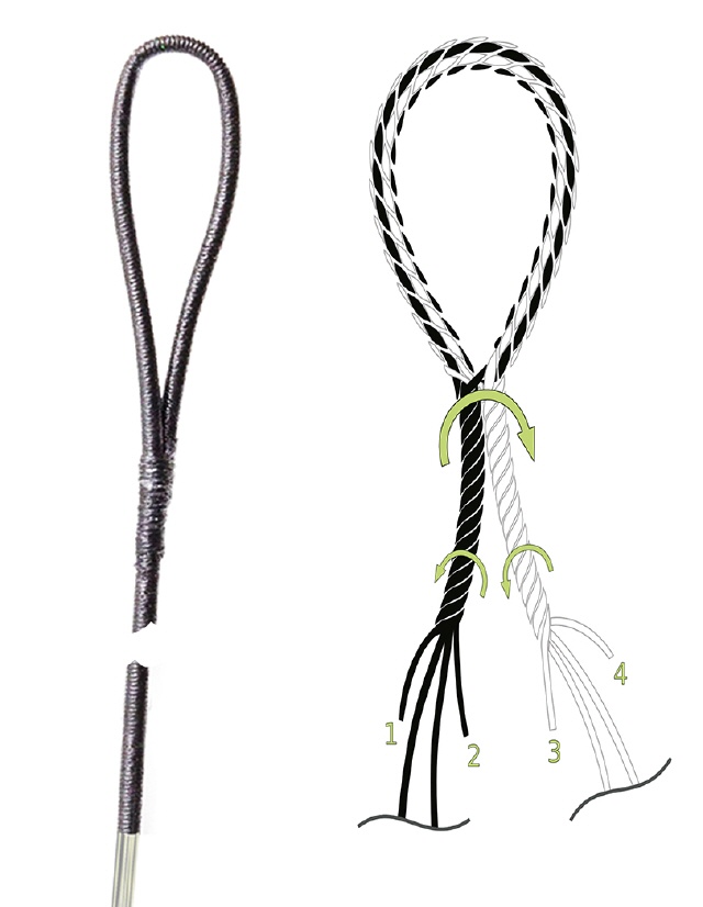 Bei dieser Machart werden die Kunststoff-Stränge miteinander fest verflochten. Es gibt wenig Hohlräume zwischen den einzelnen Seilen. Die Schlaufen zum Einhängen an den Enden (die sogenannten „Sehnenöhrchen„) werden am Ende eingespleißt, sodass ein Lösen fast unmöglich ist. Von der Optik her ist eine solche Bogensehne der traditionellen Sehne sehr ähnlich. Für den Bogenschützen fühlt sie sich sehr sanft an und beim Abschuss eines Pfeils ist sie so gut wie lautlos. Da eine solche flämisch gespleißte Bogensehne etwas nachgibt, wird ein Teil der Bogen-Energie abgefangen, was wiederum auf Kosten der Geschwindigkeit des Pfeils geht.