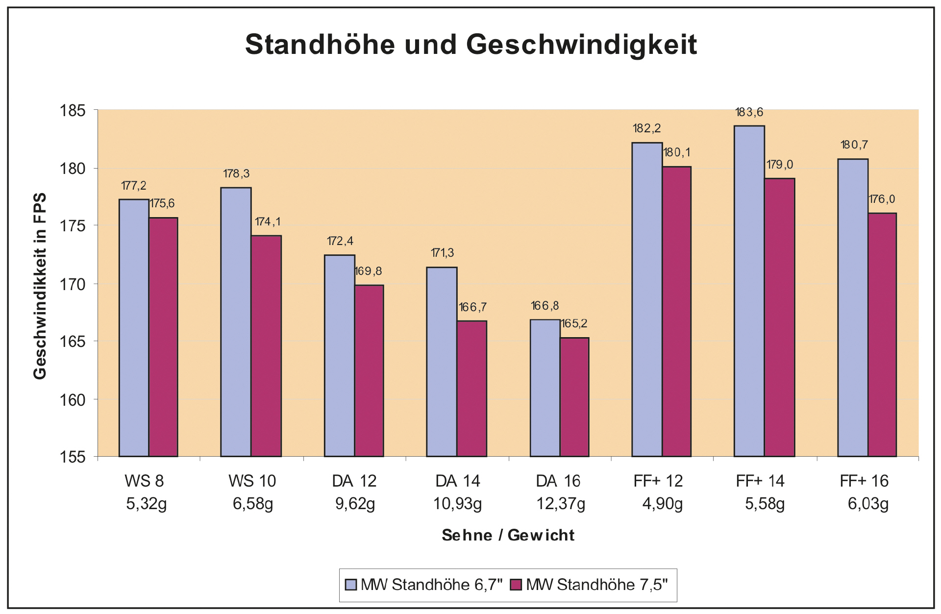 Bestätigt haben sich einige Dinge, die fast selbstverständlich sind. Bei höherer Strangzahl und bei größerer Standhöhe nimmt die Pfeilgeschwindigkeit ab. Ebenso wirkt sich der Sehnendämpfer eher nachteilig auf die Geschwindigkeit aus.