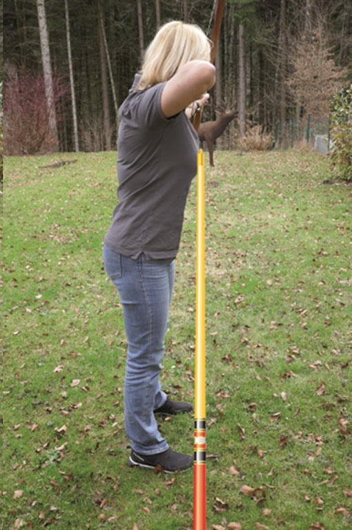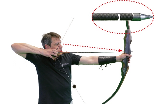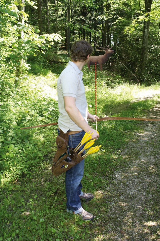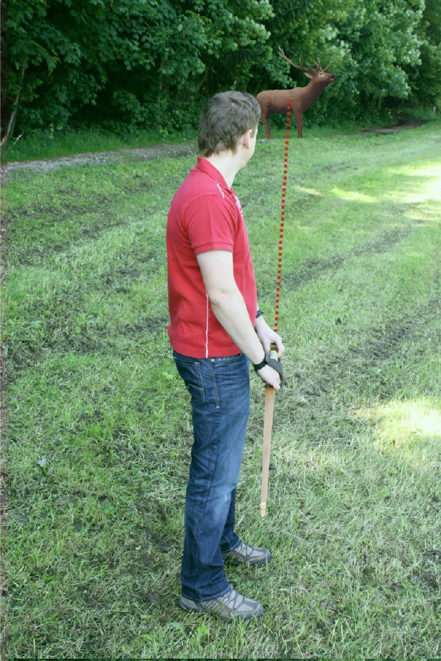 Kontrolle der Bogenhaltung Ein Pfeil wird vom Partner an den Bogen, der andere an die Augenachse gelegt. Die Pfeile müssen dann einen rechten Winkel bilden. |