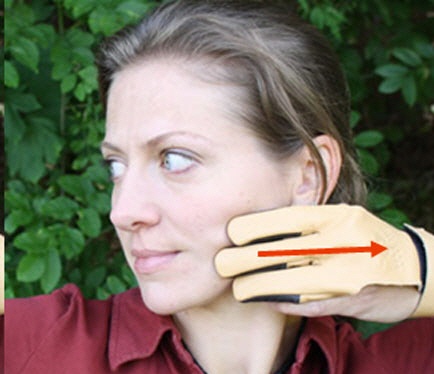Mit freiem Auge kann man sehen, ob die Hand fest im Gesicht liegt und ob die Sehne vor dem Auge ist. |