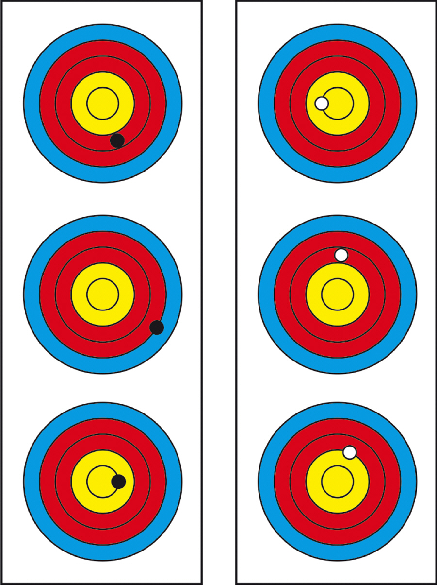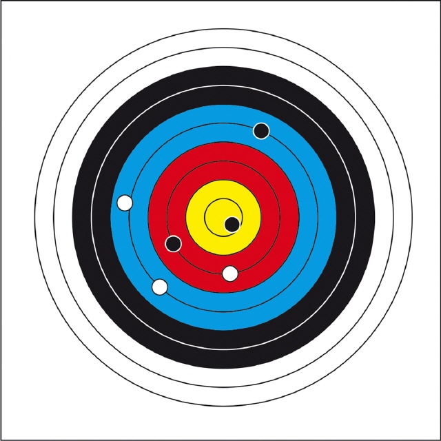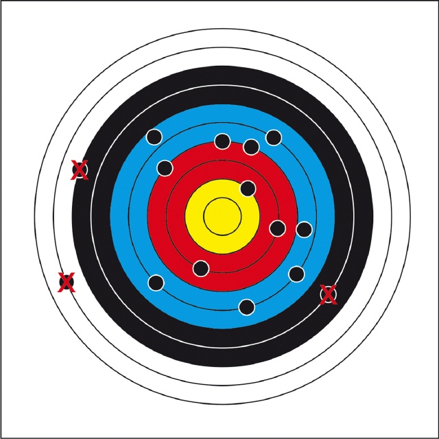 Es werden 5 x 3 Pfeile auf eine beliebige Entfernung auf eine 10-Ring-Scheibe geschossen.