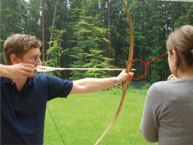 Trifft jemand einmal zu tief, das andere Mal viel zu hoch und kann nicht sagen warum, sollte man folgendermaßen vorgehen. Unter der Annahme, dass bei Schüssen auf das gleiche Ziel die Pfeilspitze im Raum beim Abschuss immer an der gleichen Stelle sein muss, kann man dies sehr leicht überprüfen. Man schießt mehrere Pfeile aus der gleichen Position immer auf das gleiche Ziel. Trifft man nicht, darf man aber nicht korrigieren! Ein Partner stellt sich nun in einer Entfernung von rd. drei Meter so hin, beobachtet die Pfeilspitze und merkt sich im Hintergrund genau den Punkt, an dem sie beim Abschuss stand. Das macht man öfter hintereinander. Verwendet man eine Videokamera, kann man das noch wesentlich besser feststellen.
