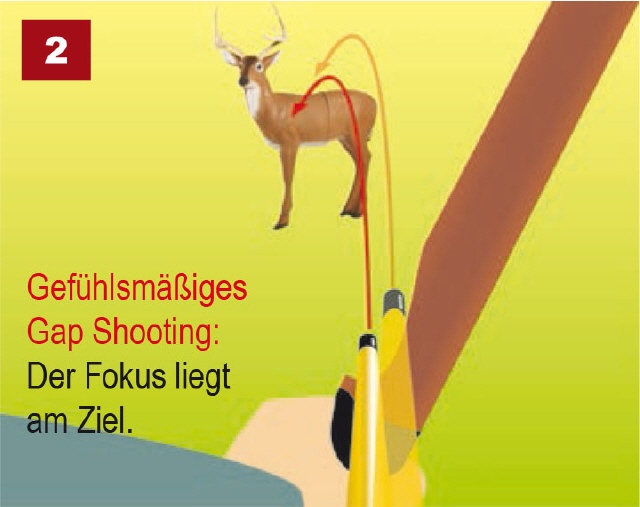 Der große Unterschied in den Zieltechniken ist dabei zum einen der Fokus, also auf was man seine Aufmerksamkeit richtet. Beim Systemschießen mit der Pfeilspitze (point of aim) liegt er auf dem Punkt, auf den die Pfeilspitze zeigt. Scharf sollte man allerdings die Stelle sehen. Die Pfeilspitze selbst ist dann unscharf. Der zweite Unterschied ist, dass man beim Systemschießen den Punkt, auf die die Pfeilspitze dann gehalten wird, vor dem Schuss, also bevor man aufzieht, festlegt. Beim Gap Shooting liegt der Fokus am eigentlichen Ziel. Stellt man den gefühlsmäßig ein, muss man den Pfeil mit einem Seitenblick mit betrachten. Macht man es systematisch, ist der Abstand zwischen Pfeilspitze und Ziel im Fokus. Im Gegensatz zum Systemschießen wird aber alles erst "eingestellt", wenn man bereits aufgezogen hat.
