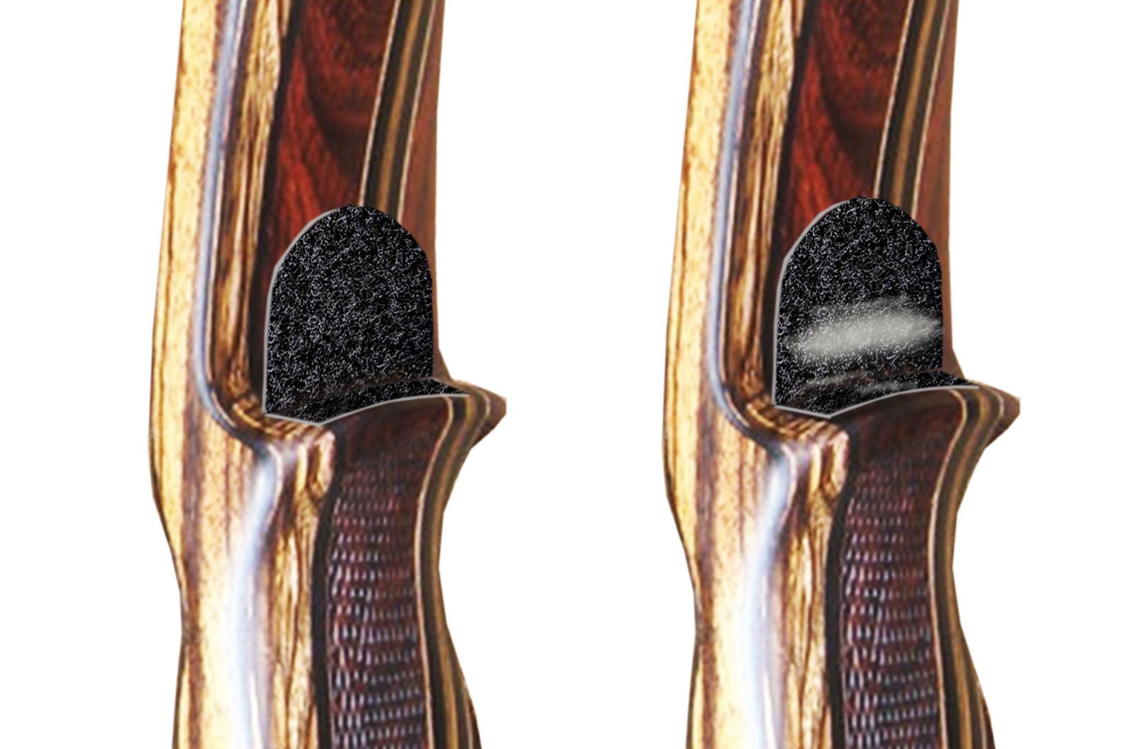 Ein Recurvebogen hat üblicherweise ein sehr breites Schussfenster. Schießt man vom Shelf, kann der Pfeil eine zu große Auflagefläche haben. Das sollte man auf alle Fälle ausgleichen. Man unterlegt dabei die Pfeilauflage. Damit erreicht man zum einen die Erhöhung um ca. 5 bis 10 mm und die Auflage wird dadurch fehlerverzeihender.