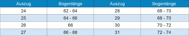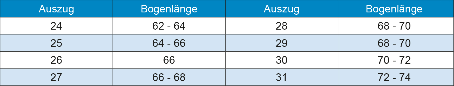 Die Wahl des richtigen Bogens und der passenden Bogenlänge ist sehr wichtig, um optimale Ergebnisse zu erzielen. Ein wichtiger Punkt dabei ist die Auszugslänge. Je nach Auszugslänge gibt es unterschiedliche Empfehlungen für die passende Bogenlänge (Tabelle unten: Auszug und Bogenlänge). Es ist wichtig zu beachten, dass dies allgemeine Empfehlungen sind und persönliche Präferenzen, individuelle Fähigkeiten und Schießtechniken ebenfalls eine Rolle spielen können. Sehr lange Bögen werden eher im olympischen Bereich verwendet.