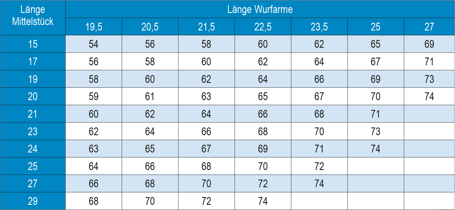 Die Größe für ein Standard-Mittelteil ist in der Regel 25 Zoll. Schaut man sich die Angebote der Hersteller an, findet man Mittelteile von 19,5 bis 27 Zoll und Mittelteile von 15 bis 29 Zoll. Damit ergeben sich eine Unmenge an Kombinationsmöglichkeiten (Tabelle und Grafik unten: Mögliche Verhältnisse).