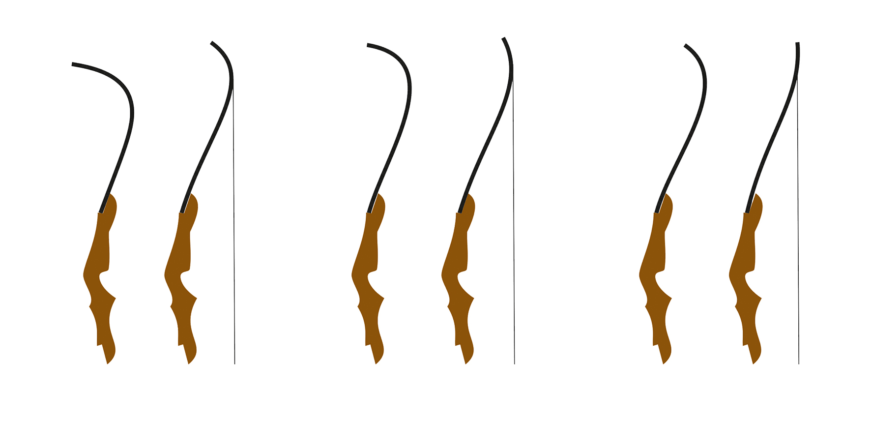 Im Bild auf der rechten Seite oben sind einige Varianten dargestellt. Dabei ist die Variante C eher ein Hybridbogen. Der Bogen B entspricht einem herkömmlichen Recurve. Und das Beispiel A hat einen extremen Recurve. Bei solchen Bögen hat man beim Ziehen das Gefühl, dass es ähnlich wie bei einem Compound eine Zuggewichtsreduzierung gibt. Ist objektiv gesehen nicht so, fühlt sich aber so an. Auch ist hier Vorsicht geboten. Die Sehne kann sehr leicht vom Bogen rutschen. Deshalb darf man hier beim Ziehen den Bogen nicht verkanten.