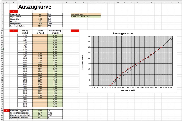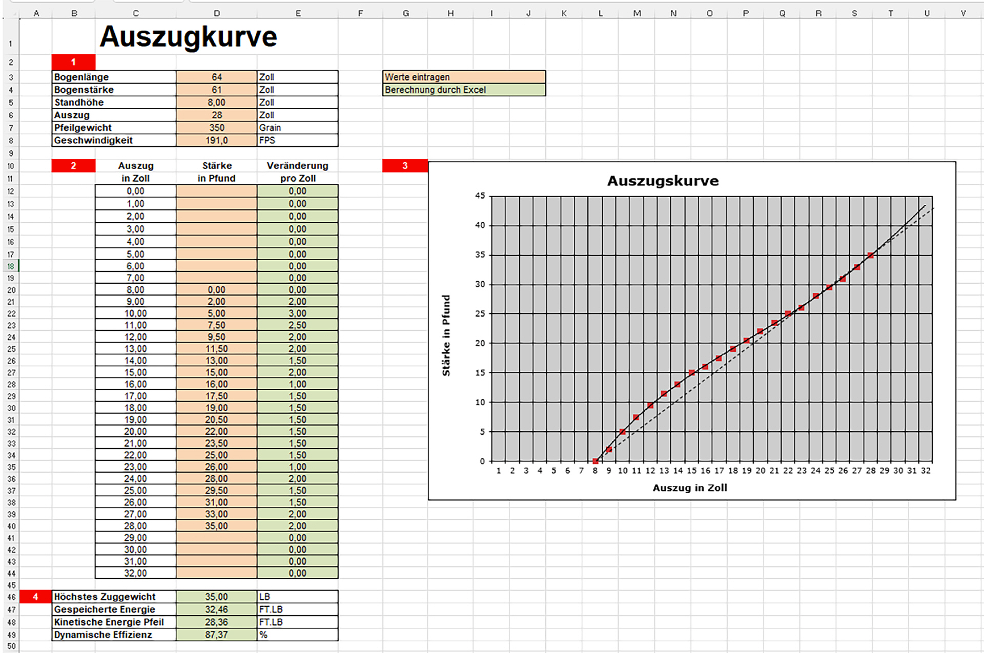 Dieses Excel-Sheet ermöglicht die Erstellung einer Auszugskurve für Bögen auf Basis gemessener Zuggewichte. Nach Eingabe der Messwerte berechnet das Sheet automatisch relevante Kennwerte wie maximales Zuggewicht, gespeicherte Energie, Pfeilenergie und Effizienz und stellt die Auszugskurve grafisch dar.