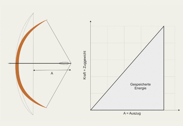 Die Energie, die von einem Bogen gespeichert wird, kann man grafisch darstellen. Die Fläche unter der Kurve stellt die gespeicherte Energie dar. Die Steigung der Kurve zeigt die Zunahme der gespeicherten Energie zu einem bestimmten Auszug (Bild 1).