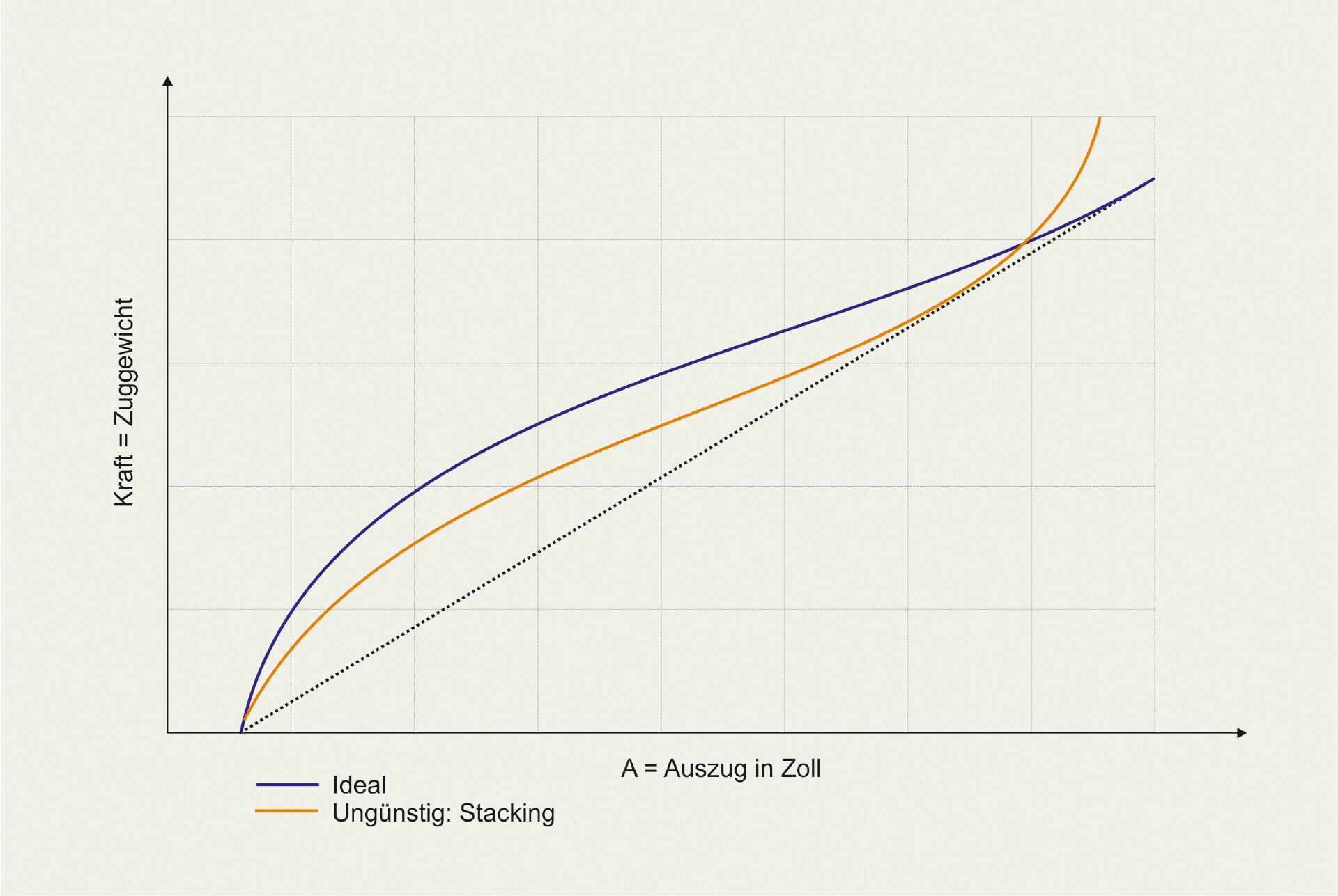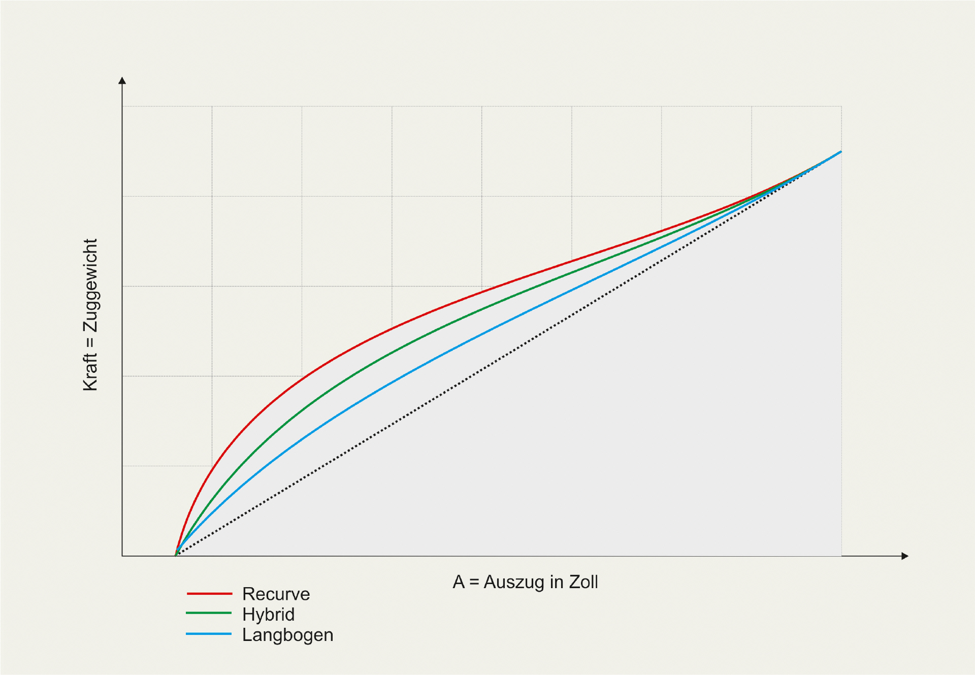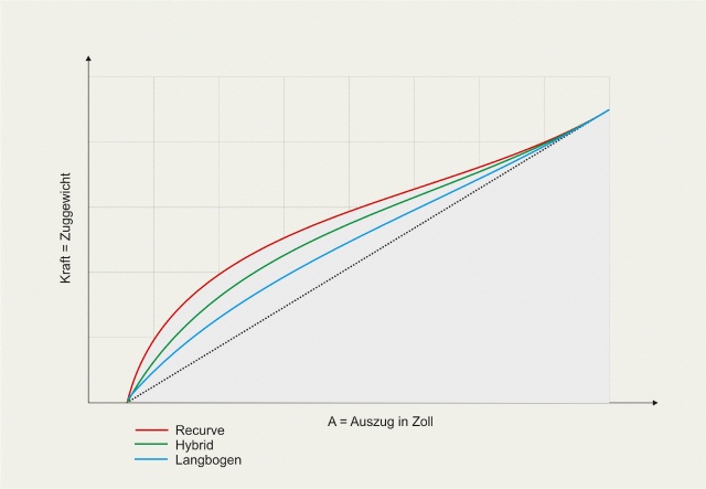 Ein Bogen, den man zieht, hat aber keinen linearen Verlauf dieser Kurve. Die in den Bildern dargestellte gestrichelte Linie ist nur die Referenzlinie. Ein solcher Verlauf würde anzeigen, dass die Zunahme der gespeicherten Energie bei jedem Zoll Auszug gleichbleibt. Die Kurve ist vielmehr geschwungen. Je größer die Fläche unter der Kurve, desto mehr kann ein Bogen Energie beim Auszug speichern. Ein Recurve speichert mehr als ein Hybridbogen und dieser wiederum mehr als ein Langbogen. Je gerader die Wurfarme eines Bogens sind, desto näher liegt die Auszugskurve an der Referenzlinie. Natürlich kommt es auch auf die Bauweise der einzelnen Bögen an. Je nachdem wie z.B. ein Recurve gebaut ist, werden sich auch die Kurven der einzelnen Bögen unterscheiden (Bild 2).