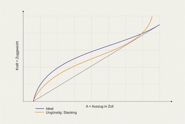 Ist die Kurve am Anfang des Auszugs weit von der Referenzlinie entfernt, so zieht sich der Bogen hier schwer. Ist er am Ende dagegen weit weg, so stacked er. Das bedeutet, dass der Bogen fast nicht mehr weiter zu ziehen ist, was eher schlecht ist (Bild 3).