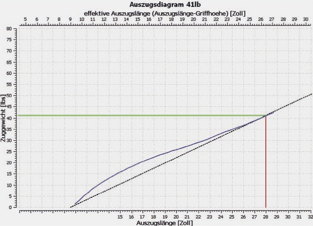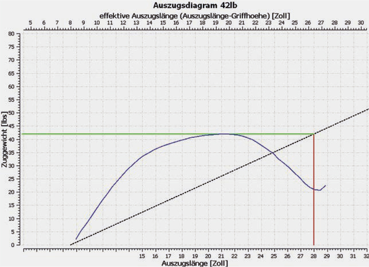 Ein kurzer Bogen, der bis an die Grenzen seiner Belastbarkeit gezogen wird, stackt und lädt sich mit überproportional viel Kraft pro Zoll auf. Daher fühlt er sich unangenehm im Vollauszug an. Hier spricht man von einer Stack-Linie, also dem Ende der gleichmäßigen Federbiegung, die Kurve bricht nach oben aus.