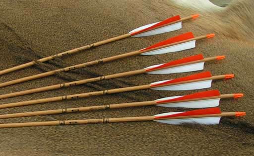 Bereits nach einigen Tagen kamen die Pfeile und ich war gespannt, wie das Flugverhalten sein würde. Roman hatte mir Gold Tip-Pfeile 3555 im traditional Design gemacht. Ich schieße normalerweise 11/32 Zedernschäfte mit 60# Spine und 5“ Federn. Mit der gleichen Befiederung habe ich diese Pfeile nun versehen.