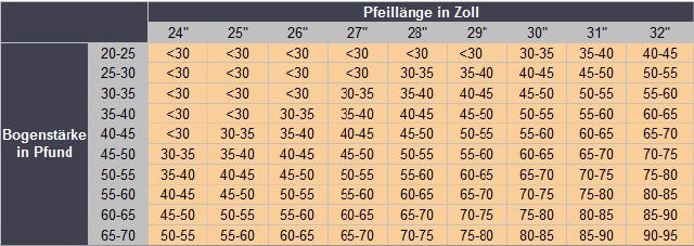 Spine in Pfund = Pfeillänge : Durchbiegung in Zoll