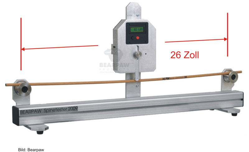 Was ist der Spinewert genau? Es ist die Durchbiegung des Pfeiles. Dabei wird ein Gewicht von zwei englischen Pfund in der Mitte eines Schaftes angehängt, dessen Auflagepunkte 26 Zoll auseinander liegen. Dadurch biegt sich der Pfeil und die Durchbiegung kann in Zoll abgelesen werden. Die Bandbreite der Durchbiegung geht dabei von 1,300 bis 0,250 (oft auch geschrieben 1.300 bis .250). Je mehr sich eine Pfeil durchbiegt, desto weicher ist er. Eine Durchbiegung von 1,300 Zoll ergibt damit einen sehr weichen Pfeil von 20 Pfund.