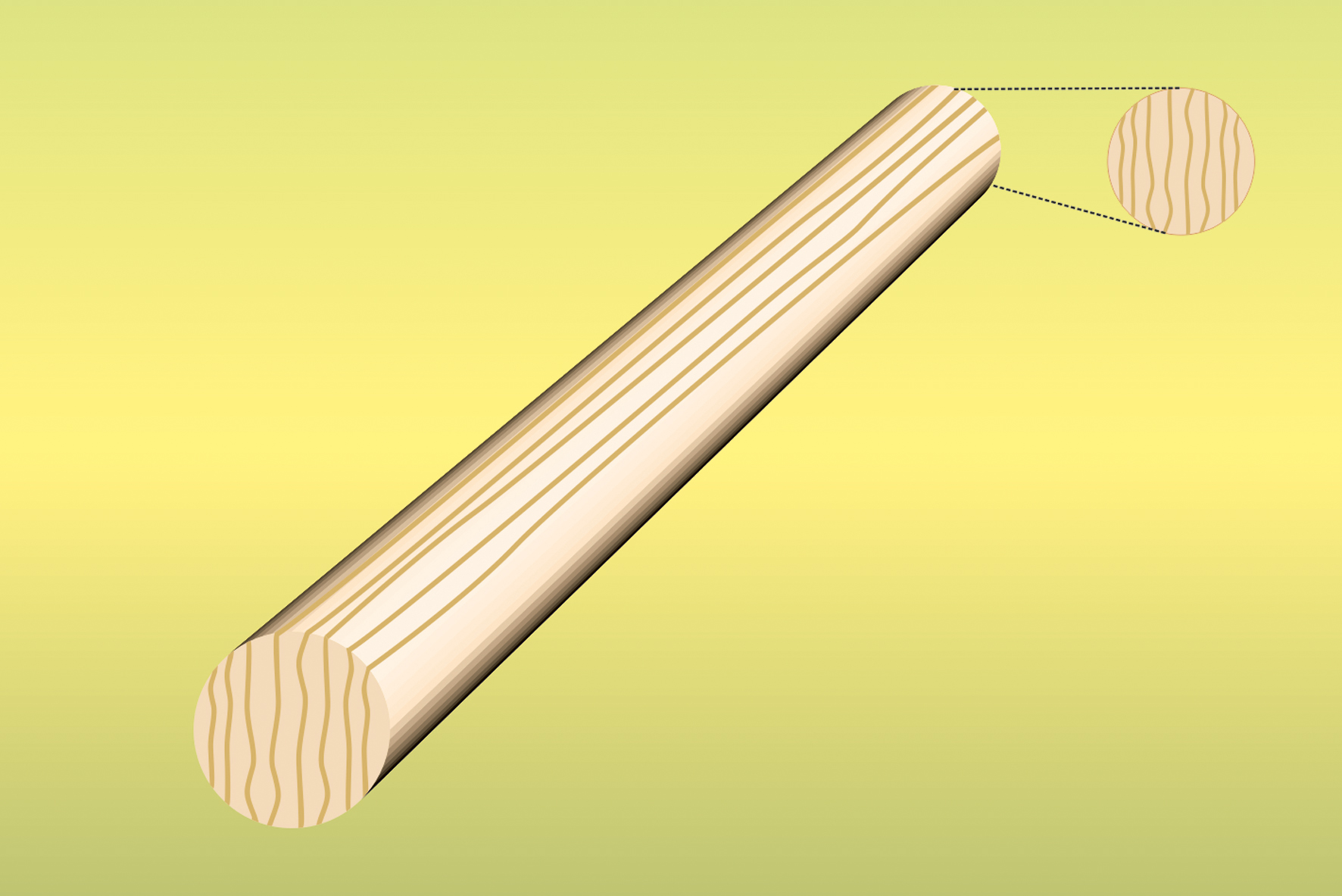 Für das bloße Auge sind die Jahresringe meist gut sichtbar, die mitentscheidenden Zellstrukturen innerhalb der hellen Zuwachszone jedoch nicht. Die Jahresringe gehen oft nicht gleichmäßig durch den Schaft, sind in sich verdreht oder laufen, bedingt durch schlechten Zuschnitt, diagonal aus dem Schaft heraus (Bild 4). Jahresringe verlaufen zudem innerhalb des Baumstamms im Kreis, haben also eine leichte Krümmung im Querschnitt des Schaftes.