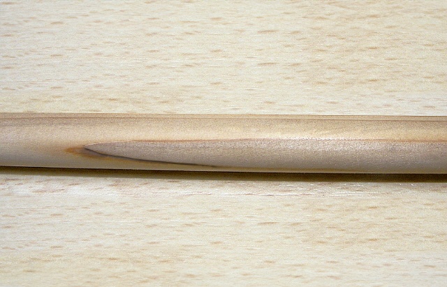 Orientiert man sich nun an den im Querschnitt sichtbaren Jahresringen im Hinblick auf die Nock-Anbringung und Befiederung, kommt noch ein äußerst wichtiges Element hinzu, nämlich die Ausrichtung des Schaftes unter Beachtung der durch auslaufende Jahresringe verursachten Flammen oder Fladern auf dem Schaft (Bild 6).