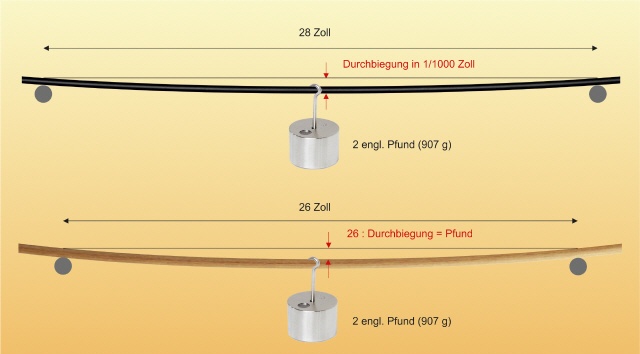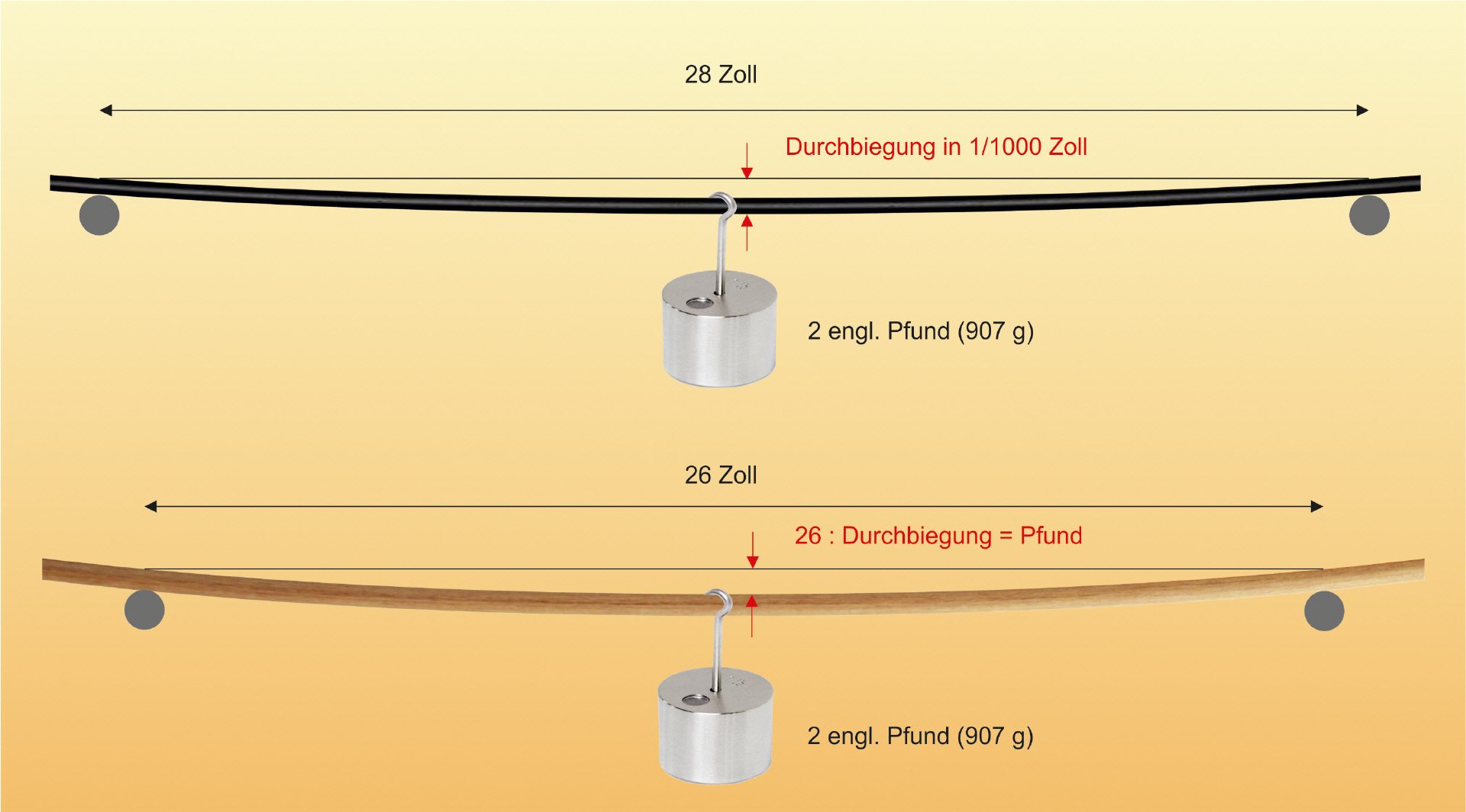 Bei Holzpfeilen ist das etwas anders. Hier ist der Auflageabstand 26 Zoll und der Spine wird in Pfund gemessen. Dazu muss die Durchbiegung umgerechnet werden.