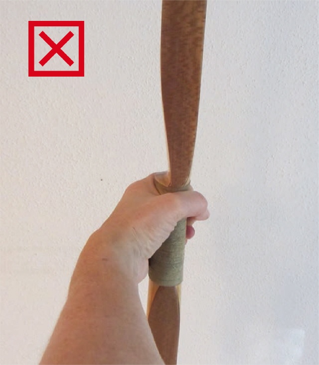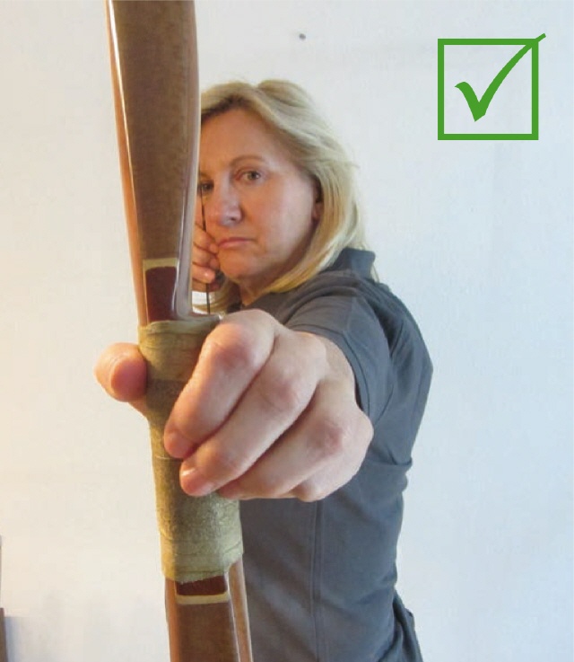 Zum einen muss der Bogen gut und stabil in der Hand liegen, zum anderen darf aber der Bogen beim Abschuss durch zu festes Halten nicht verdreht werden. Der Bogen muss aber trotzdem so fest gehalten werden, dass er nach dem Abschuss nicht aus der Hand springt.
