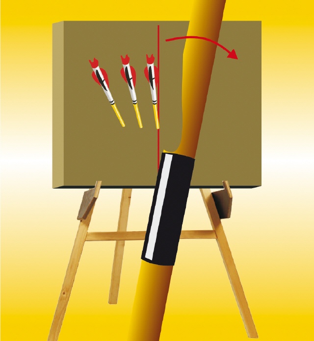Es ist aber nicht egal, wie stark der Bogen umgelegt wird. Ungefähr 20 bis 30 Grad sind üblich. Hier muss jeder Schütze eigene Erfahrungen sammeln, wie stark der Bogen geneigt werden soll. Dabei muss aber eines beachtet werden. Neigt man den Bogen, wandert der Pfeil immer weiter aus dem Ziel, da der Drehpunkt des Bogens nicht auf der Höhe des Pfeils liegt.