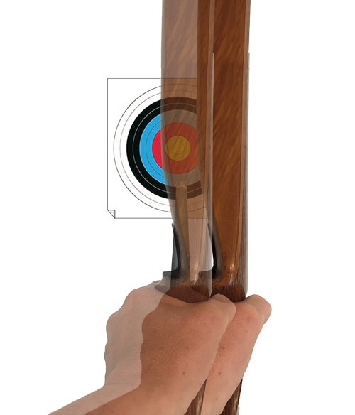 Bei einem Langbogen oder einem Recurvebogen mit einer kleiner Pfeilauflage kann der obere Wurfarm das Bild eines Auges verdecken. Das Ziel bleibt zwar sichtbar, aber die räumliche Wahrnehmung geht verloren. Genau das stellt das Hauptproblem dar. Wer mit einem Zielsystem wie der Pfeilspitze (Point of Aim) arbeitet, hat hier keine Schwierigkeiten. Instinktivschützen oder Gap Shooter sollten das Ziel jedoch räumlich sehen können.