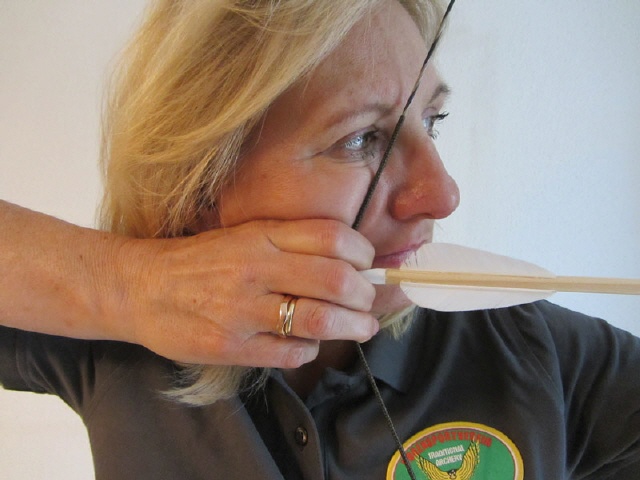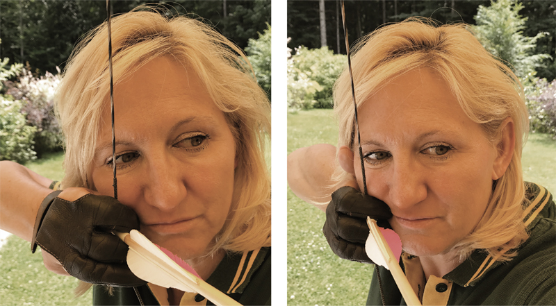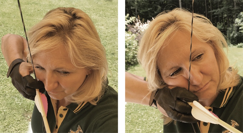 Ein wesentliches Merkmal für einen guten Schuss ist der Anker. Dabei ist es sehr hilfreich, wenn die Sehne genau vor dem Auge ist. Damit ist auch der Pfeil genau unter dem Auge und die Richtung stimmt, ohne dass ich bewusst ausgleichen muss. Wichtig ist das vor allem bei Systemschützen. Bei Instinktivschützen oder Gap Shootern muss das Gehirn diesen Ausgleich bewerkstelligen.