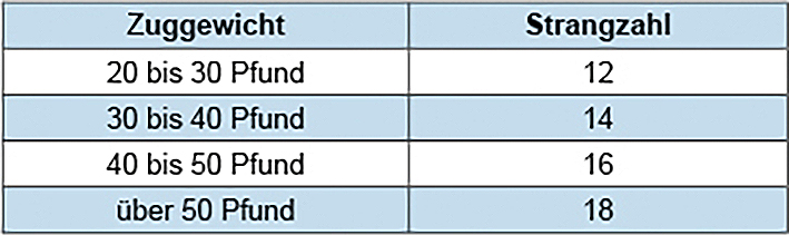 Da die Sehne einen Einfluss auf das Schussverhalten hat, sollte man aber darauf achten, dass sie nicht zu dick ist und durch das Eindrehen nicht zu dick wird. Luftwiderstand und Gewicht spielen bei der Beschleunigung natürlich eine Rolle. Je schwerer und dicker sie ist, desto langsamer ist sie auch. Daher sollte man für seinen Bogen schon von vornherein die richtige Stärke kaufen. Untenstehende Tabelle gibt einen Richtwert über die Strangzahl der Sehne vor.
