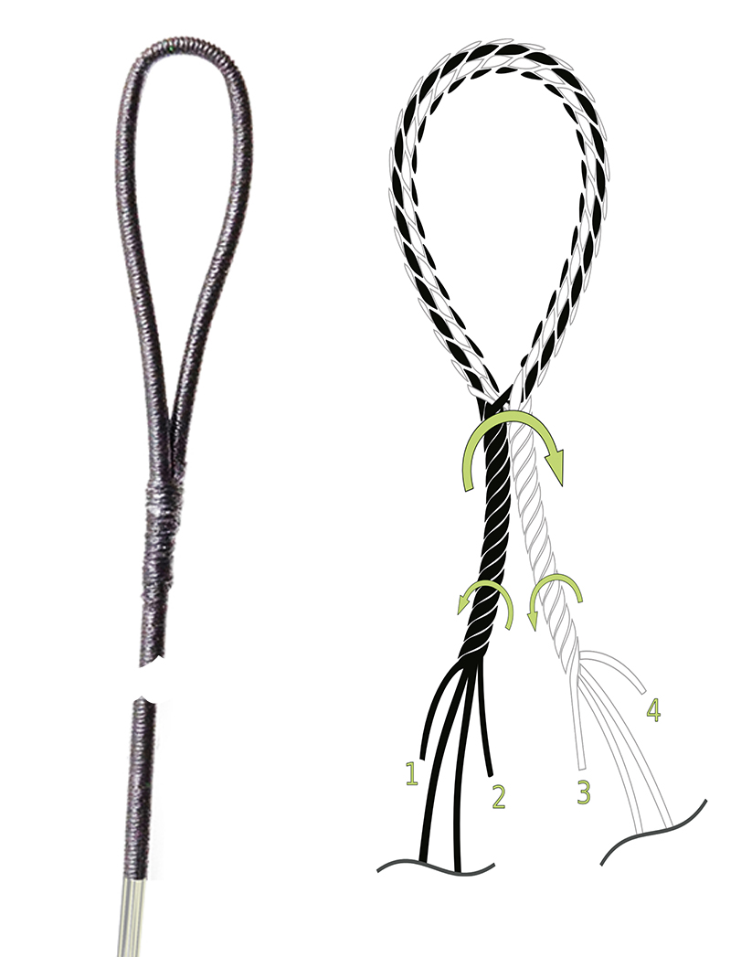 Bei dieser Machart werden die Kunststoff-Stränge miteinander fest verflochten. Es gibt wenig Hohlräume zwischen den einzelnen Seilen. Die Schlaufen zum Einhängen an den Enden (die sogenannten „Sehnenöhrchen„) werden am Ende eingespleißt, sodass ein Lösen fast unmöglich ist. Von der Optik her ist eine solche Bogensehne der traditionellen Sehne sehr ähnlich. Für den Bogenschützen fühlt sie sich sehr sanft an und beim Abschuss eines Pfeils ist sie so gut wie lautlos. Da eine solche flämisch gespleißte Bogensehne etwas nachgibt, wird ein Teil der Bogen-Energie abgefangen, was wiederum auf Kosten der Geschwindigkeit des Pfeils geht.