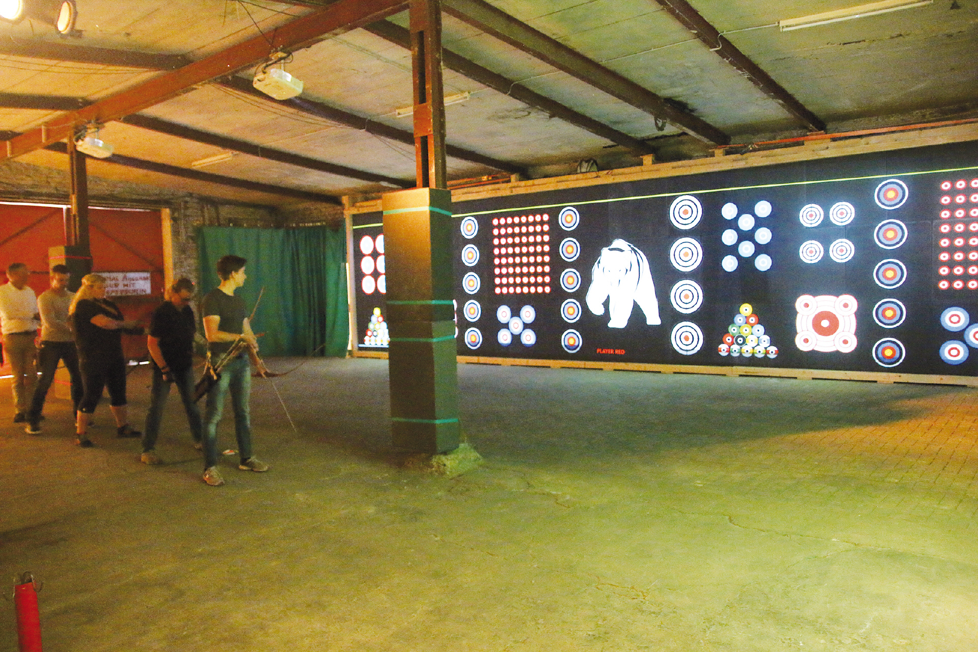 In der Corona-Zeit hat man sich etwas Spezielles einfallen lassen. Für den spielerischen Gebrauch zuhause gibt es das sogenannte Heimkino. Diese Variante ist mit einer kleinen Scheibe von 60 x 1,2 Meter ausgestattet. Der Beamer ist bewusst nicht extrem leistungsstark. Zusätzlich gibt es auch noch ein Bogenset mit einem 10-Pfund-Bogen.