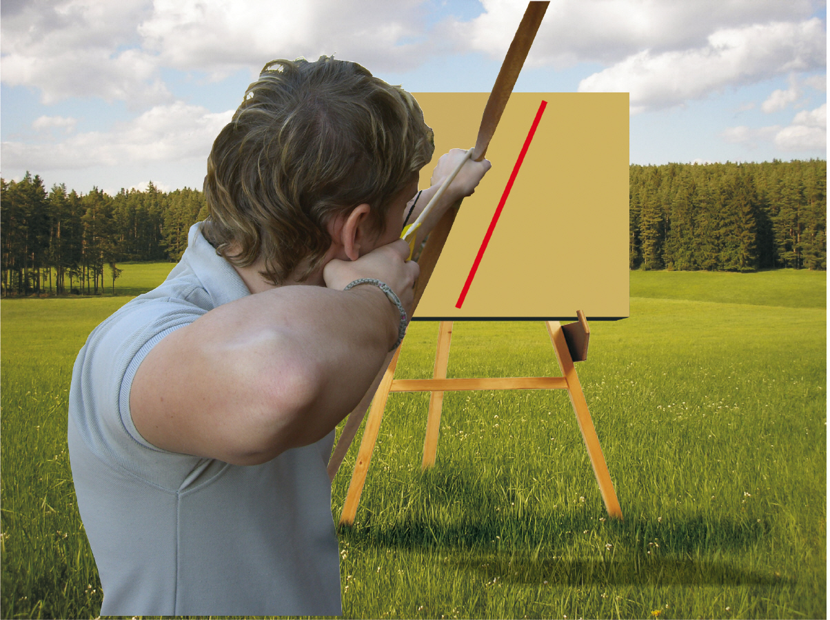 Kontrolle der Bogenhaltung Ein Pfeil wird vom Partner an den Bogen, der andere an die Augenachse gelegt. Die Pfeile müssen dann einen rechten Winkel bilden. |