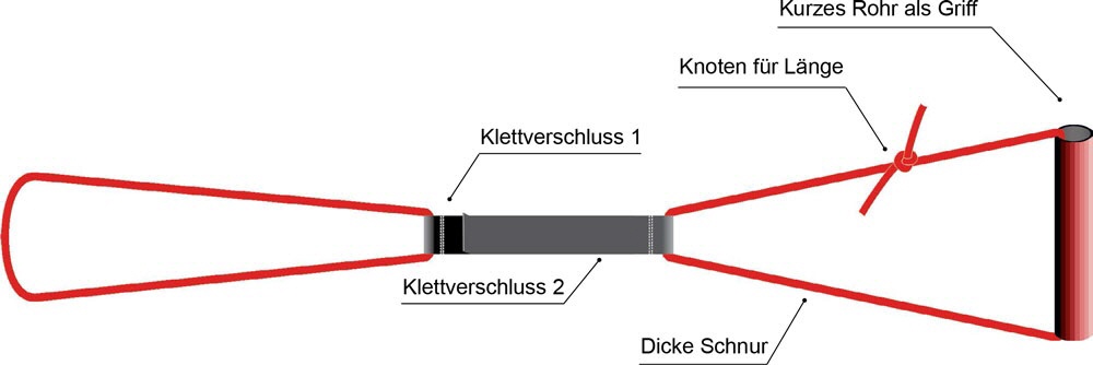 Mit dem Klettverschluss kann zum einen die Auszugslänge verändern, zum anderen kann man aber damit auch die Zugstärke des Bogens simulieren. Legt man einen längeren Bereich übereinander, löst das Gerät erst aus, wenn man einen gewissen Zug darauf bringt.