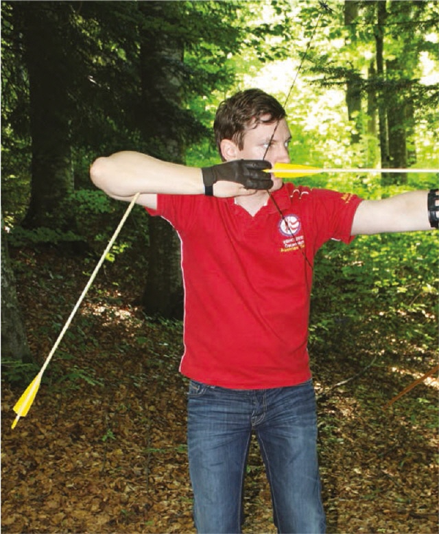 Schritt 2: Nun geht man in die Rückenspannung. Das heißt, dass man am Ankerpunkt im Gesicht bleibt und ein bis zwei Zentimeter weiter zieht. Bleibt die Hand am Ankerpunkt, und man zieht weiter, muss der Ellbogen eine Rotationsbewegung machen. Diese Bewegung sieht man von außen fast nicht. Aber es ist die Garantie, dass man aus der Spannung schießt.
