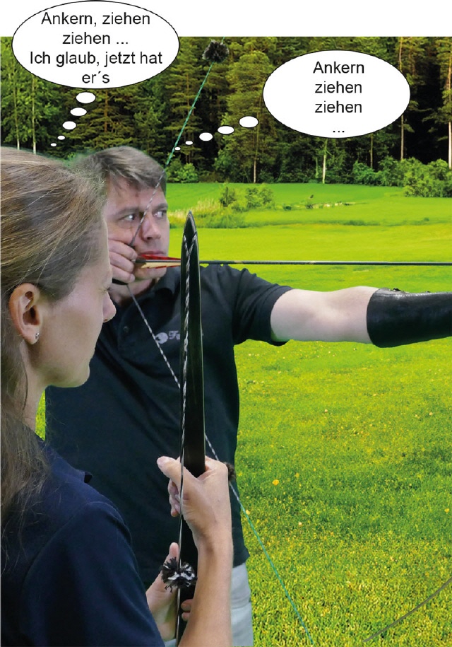 Beispielsweise sollte er erkennen, ob tatsächlich die Rückenspannung aufgebaut wurde. Das kann man unterschiedlich feststellen. Zum einen sieht man es an der Bewegung des Pfeils. Bleibt dieser stehen oder bewegt er sich kurz vor dem Abschuss nach vorne. Auch sieht man es am Schussablauf selbst. Oft kann jemand, der nicht geübt im Analysieren ist, das nicht erkennen.
