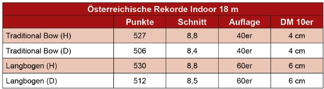 In Österreich werden Indoor-Meisterschaften nach World Archery geschossen. Dabei sind die Klassen Compound, Olympic Recurve, Barbow, Instinctive Bow (entspricht in etwa dem Traditional Recurve der IFAA) und Langbogen startberechtigt. Hier kann man dann sein eigenes Niveau an den Besten messen. Die untenstehende Tabelle zeigt die Rekorde in den traditionellen Klassen. Um mit dem Instinctive Bow beispielsweise auf diesem Level zu sein, hat man einen Streukreis von 102 Millimeter bei den Herren, bzw. 136 bei den Damen.