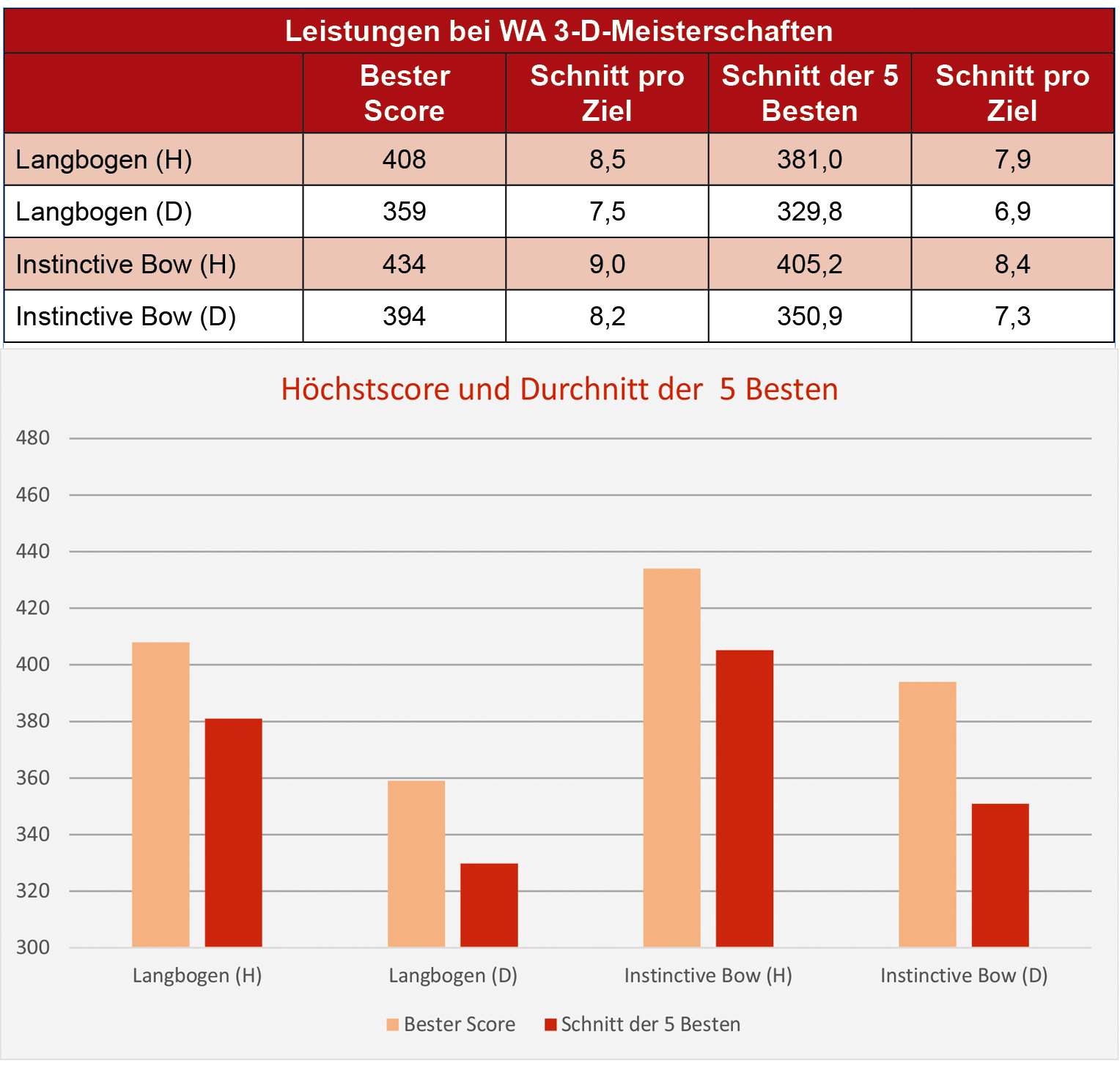 Etwas schwieriger ist es schon, den Vergleich mit 3-D-Schützen zu machen. Nimmt man die Ergebnisse z.B. der WBHC (World Bowhunter Championships) oder EBHC (European Bowhunter Championships) der IFAA kommt man der Sache schon etwas näher.