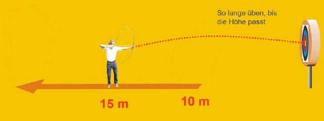 Wie lernt man nun das instinktive Zielen am besten? Das ist sehr einfach, wenn auch langwierig. Ich muss so lange eine Entfernung üben, bis ich alle Daten, sprich den Winkel der Bogenhand, in meiner „Datenbank„ abgespeichert habe. Das sollte an der Einschussscheibe genauso wie im Gelände passieren.