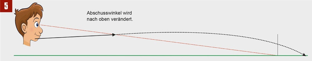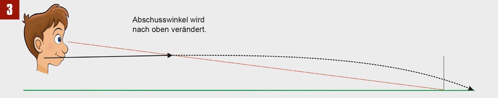 Wenn man zu tief anlegt, muss man den Abschusswinkel nach oben korrigieren. Dadurch schießt der Pfeil über das eigentliche Ziel hinaus.