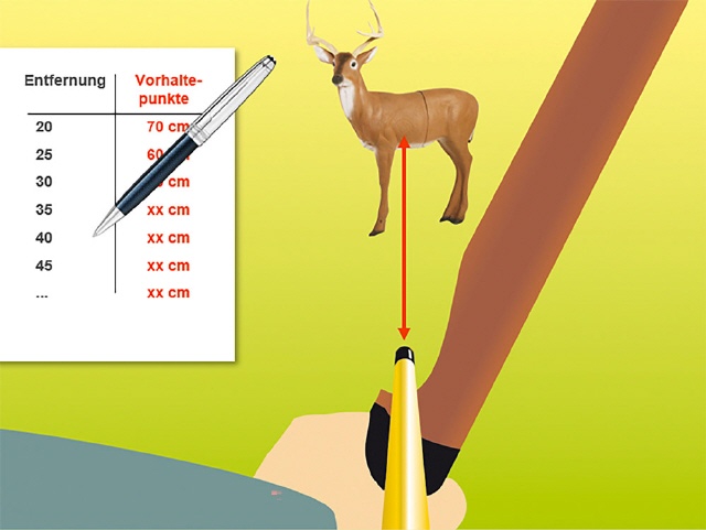 Schritt 2: Im zweiten Schritt muss nun jeder Entfernung ein Wert zugewiesen werden. Dabei notiert man sich in einer Tabelle für jede Entfernung den sogenannten Vorhaltepunkt. Am bessten verwendet man dazu einen Entfernungsmesser. Um dieses System einigermaßen genau zu erarbeiten. muss man öfter schießen. Im Lauf der Zeit sollte man es dann perfektionieren.